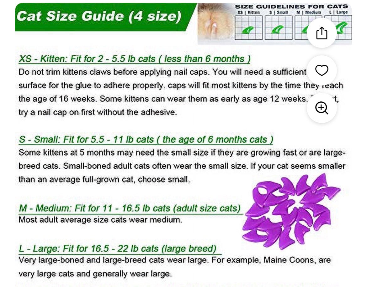 The glues have passed EU MSDS, safe and specially used for p Multifunction Animals enter estrus and begin to get grumpy in spring. It is a good items to effectively prevention of cat scratch disease, beneficial to cat claw carry out care. Avoid cat scratches the affected area with skin disease, Protect your cat itself and protect you when play with them. You will never worried you will get hurt and it won't destroy you clothing. Protect your homes and furniture against destructive scratching by applying soft claws nail caps to kittens nails., How to Use The soft nail covers can be applied on easily if two people cooperate.