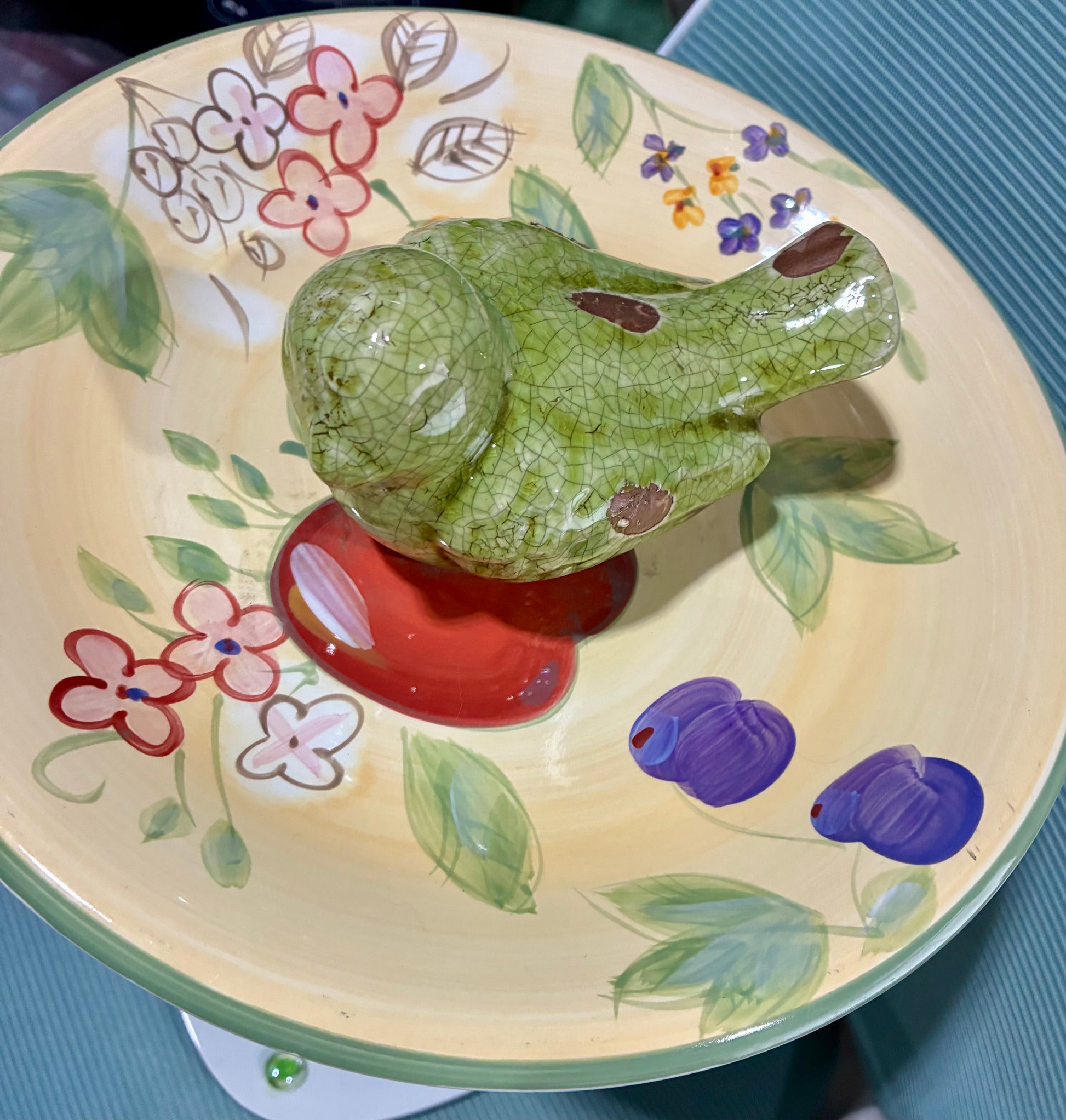 It features a lower base plate, a central glass pillar filled with small green orbs, and a larger top bowl adorned with fruit imagery.