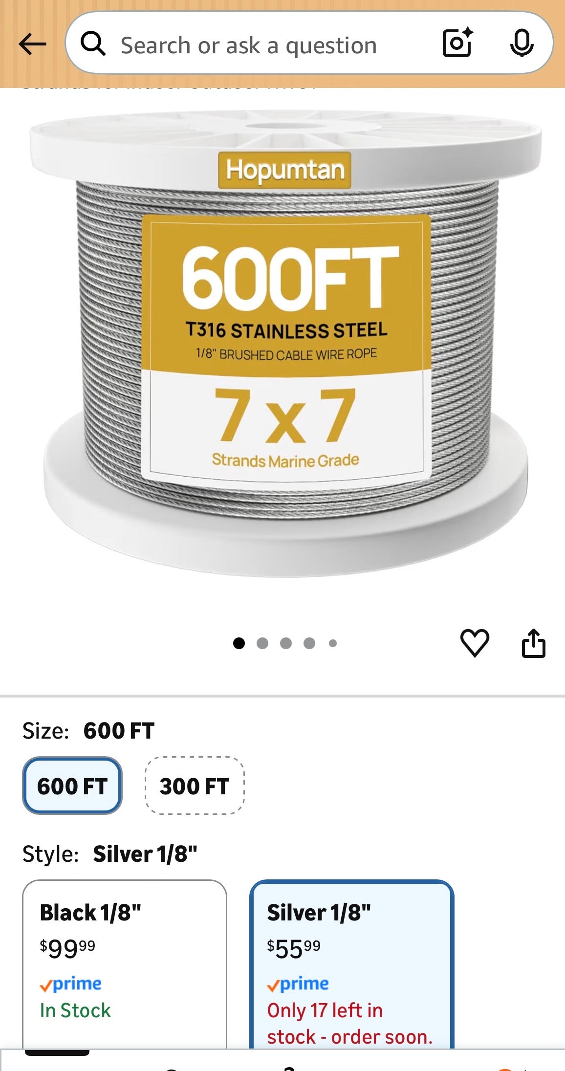 The cable wire rope presents the natural color of stainless steel. Package includes 600ft 1/8" wire rope