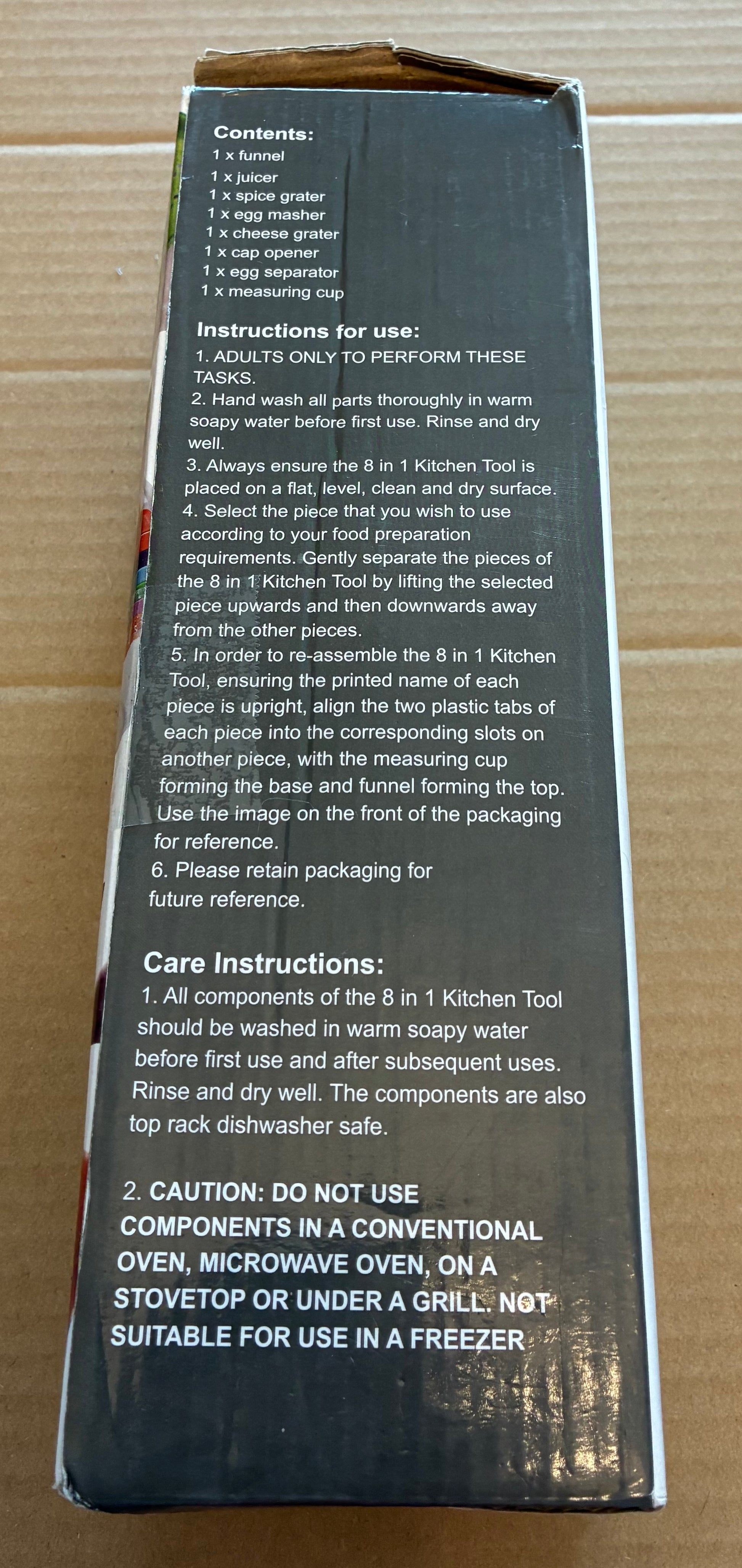 handy 8-in-1 Bottle-Shaped Kitchen Tool Set consists of 8 tools that stack together into a bottle shape Includes:' funnelflower vase, 1 juicer, 1 spice grater, 1 egg masher, 1