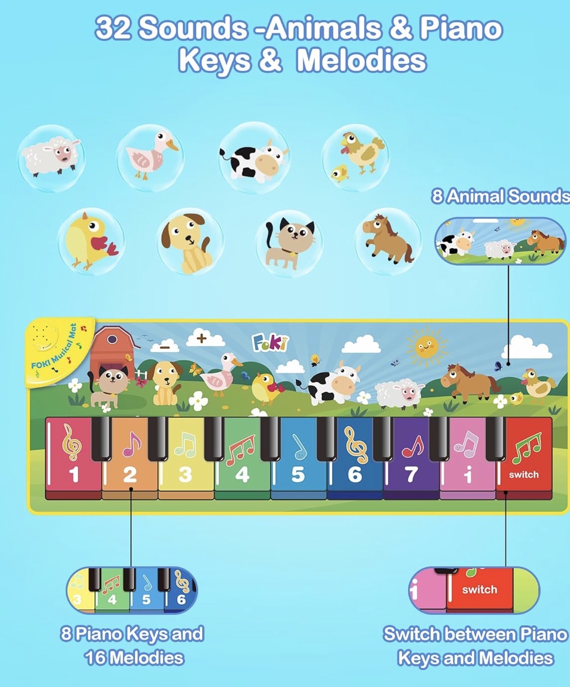 The floor piano mat features a total of 32 built-in sounds, including 8 animal sound effects and 8 piano keys that either play classic piano notes or switch to 16 fun children's melody songs