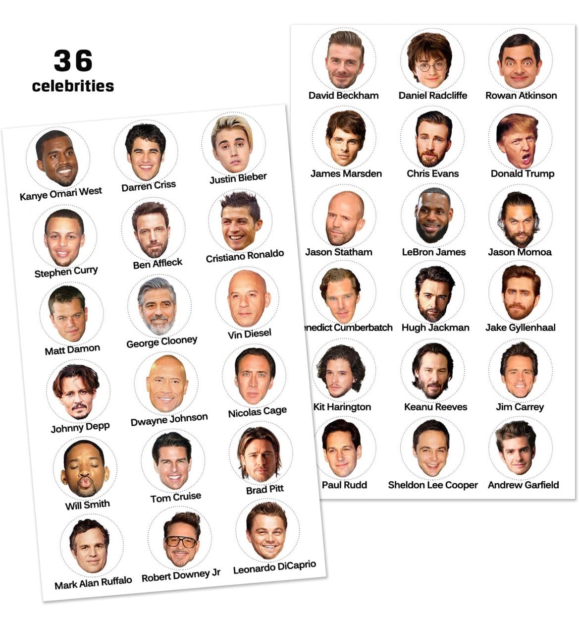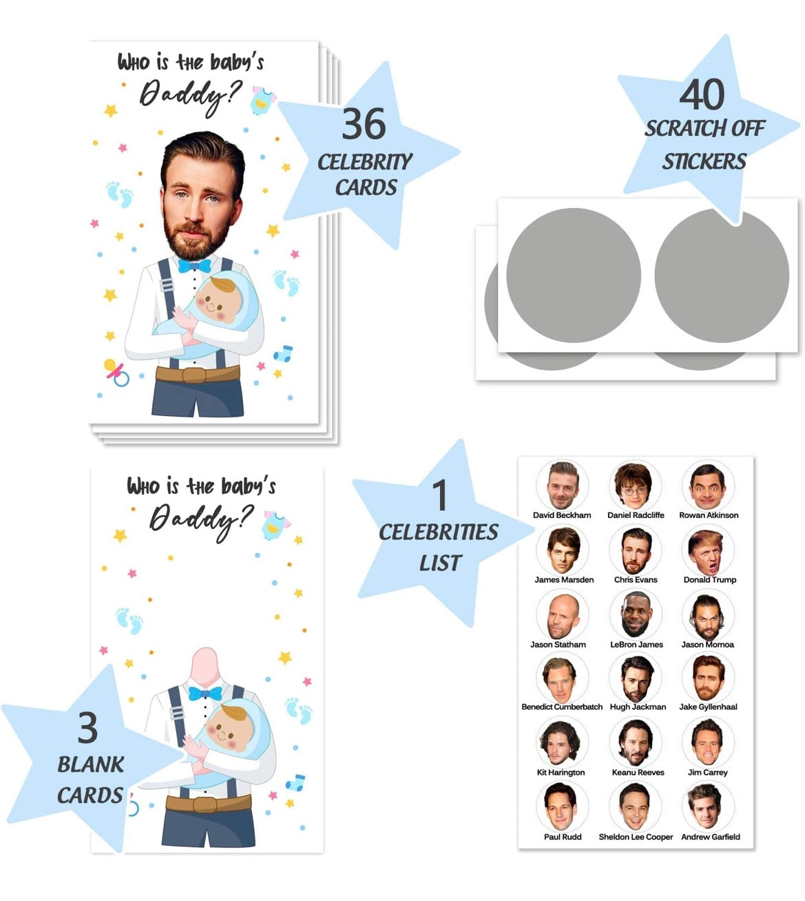 there are 40 cards(2.1*3.5in), including 36 difference famous man cards, 1 list of all celebrities and 3 blank ones, and 40 pieces of scratch off stickers in each package,