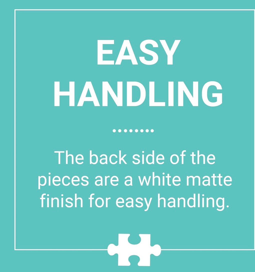 The 500 puzzle pieces are thick and sturdy, and the back sides are a white matte finish. The completed puzzle measures 20” x 20" and the package measures 8” x 8” x 1.5”.