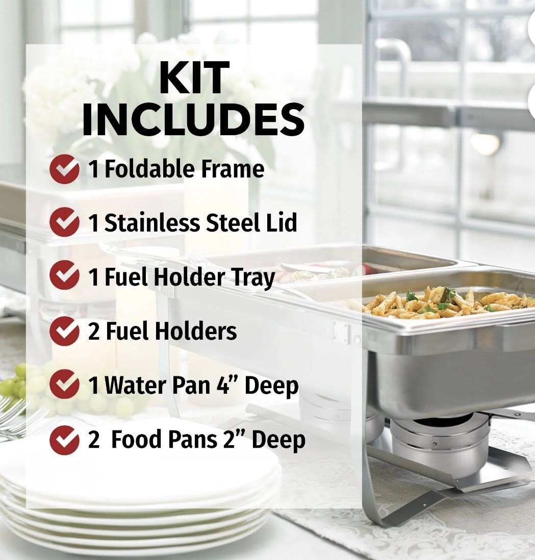 The Sterno 70153 Foldable Frame Buffet Chafer Set is an 8-quart capacity set made of high-quality stainless steel. It includes a foldable frame, lid, fuel holder tray, fuel holders, water pan, and food pans.