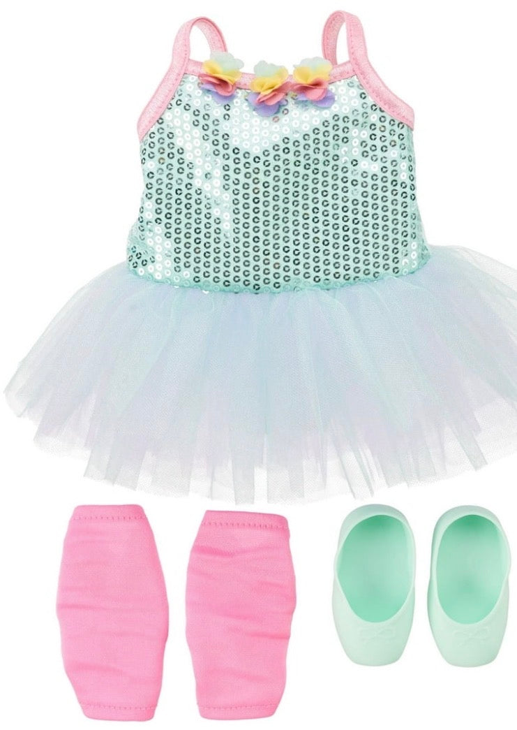Dolls outfit features a sequin leotard with colorful flowers, attached tutu, underwear, leg